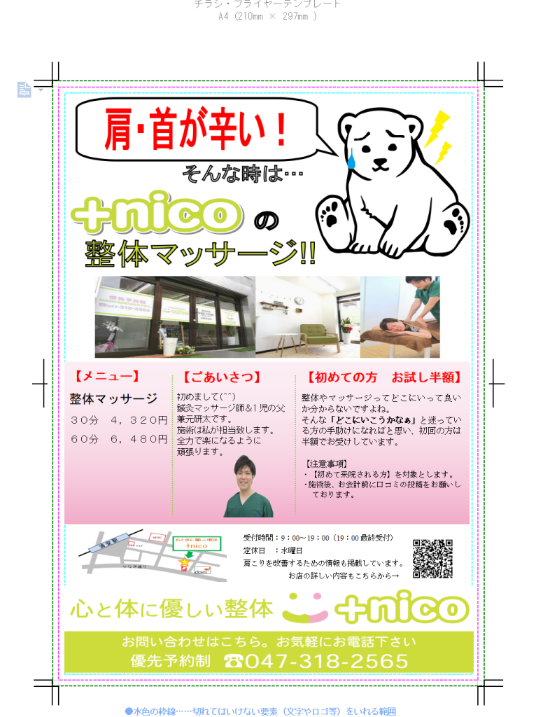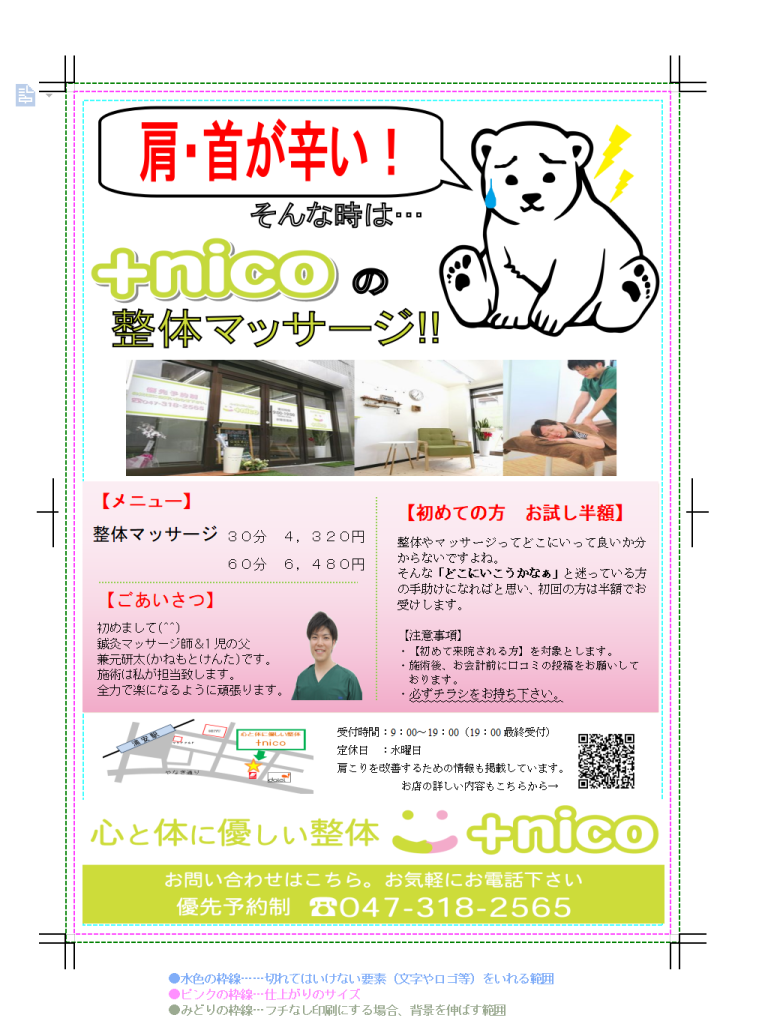 肩こり患者さんをターゲットにしたチラシです。wordで作成しています。wordで編集することが可能です。一から作るよりも作成の時間を短縮できます。
